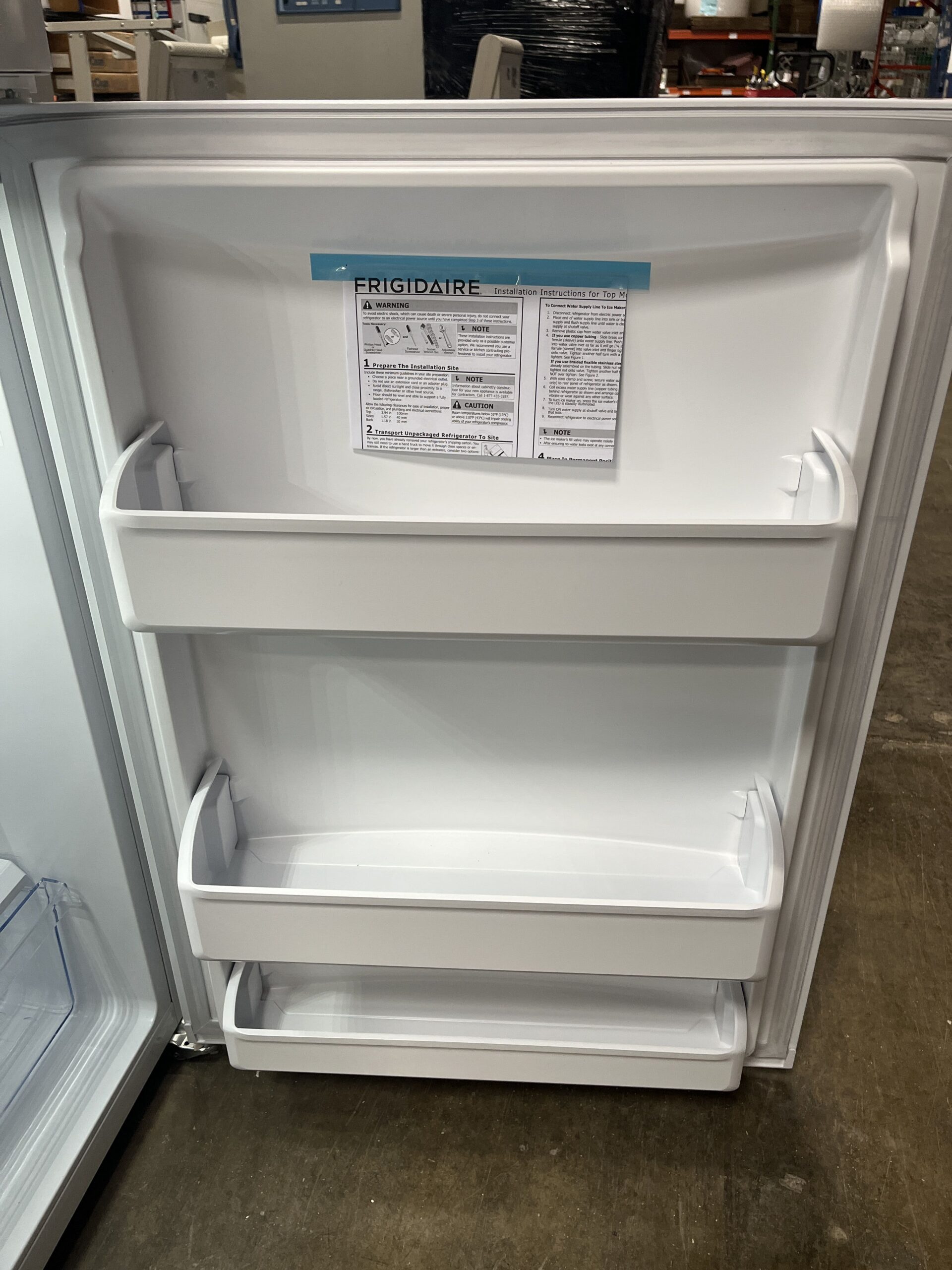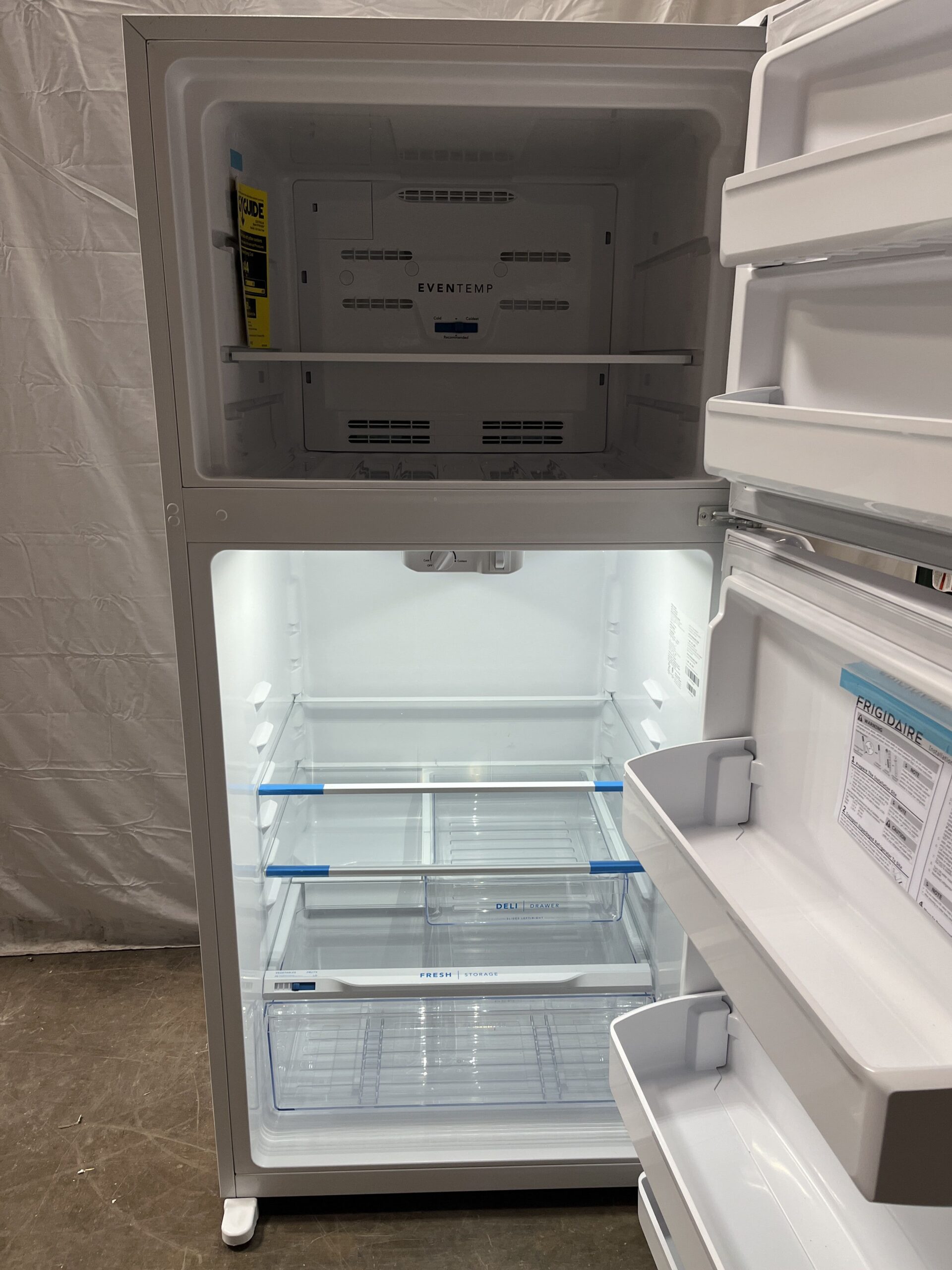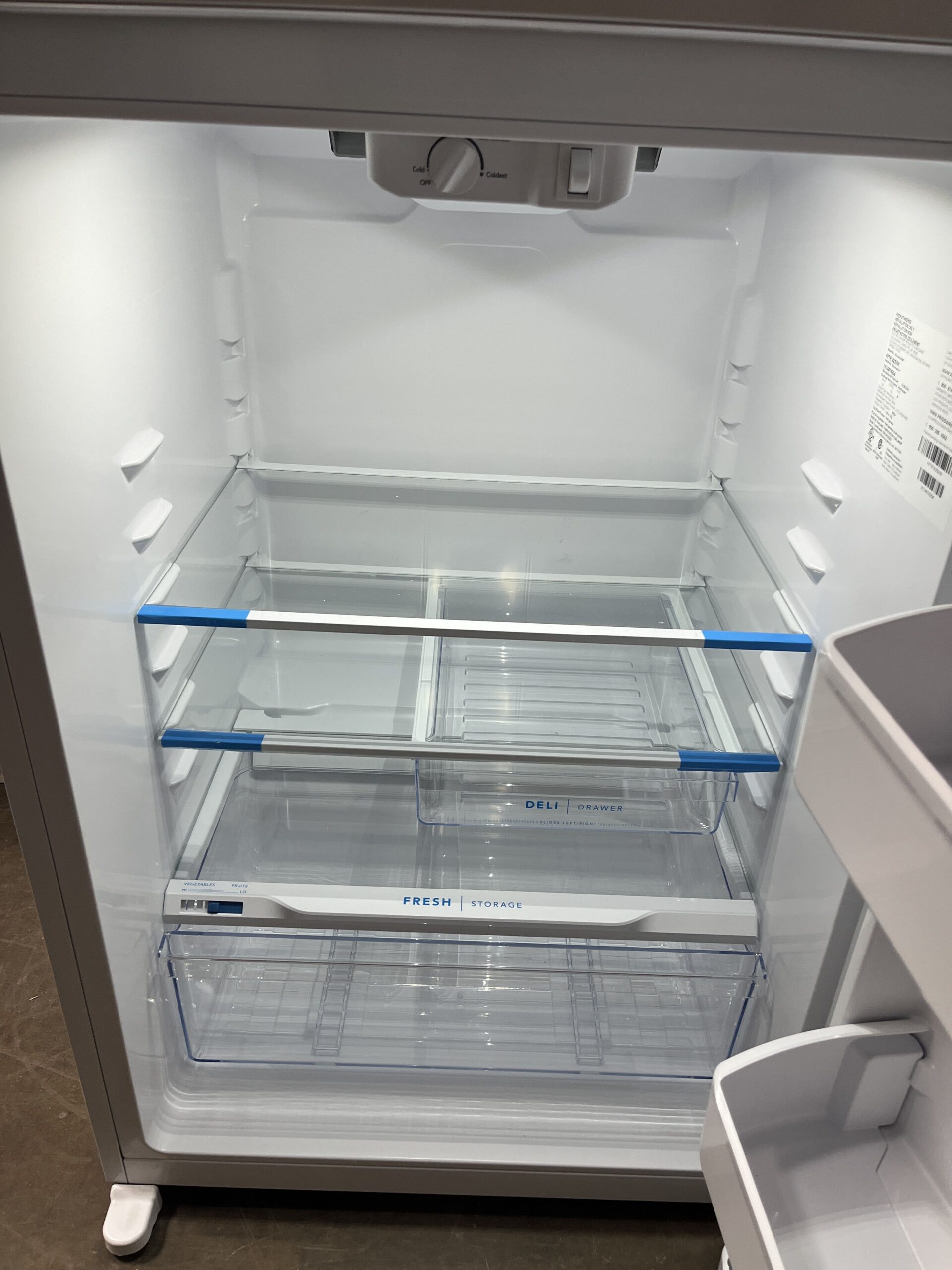 - 2 adjustable glass shelves, 1 crisper drawer, 2 fixed gallon door bins and a sliding half width deli drawer